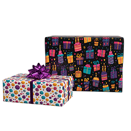 Double the party with bold presents, cakes, and candles on black paired with festive confetti dots on white. Vibrant jewel tones create energetic celebration wrap perfect for birthdays and special occasions. Two coordinating styles - use the bold side for statement gifts or flip to playful confetti for a lighter touch. 6 sheets of 27" x 38.5" - 43.33 sq ft total