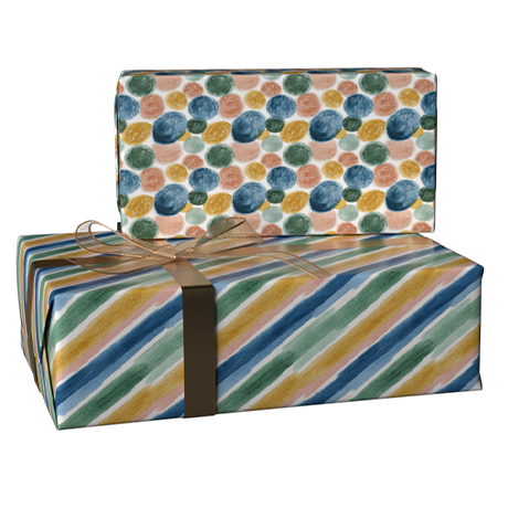 Fresh watercolor design in soft spring colors, sage green, sky blue, coral pink, and yellow. Diagonal brushstroke stripes on one side pair with organic watercolor circles on the other. Light, airy patterns perfect for birthdays, thank yous, baby showers, or any celebration that needs a breath of spring. 6 sheets of 27" x 38.5" - 43.33 sq ft total