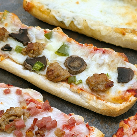 French bread base topped with pizza sauce, mozzarella cheese, sausage, mushrooms, green peppers, and onions for the ultimate pizza experience. 8 inches